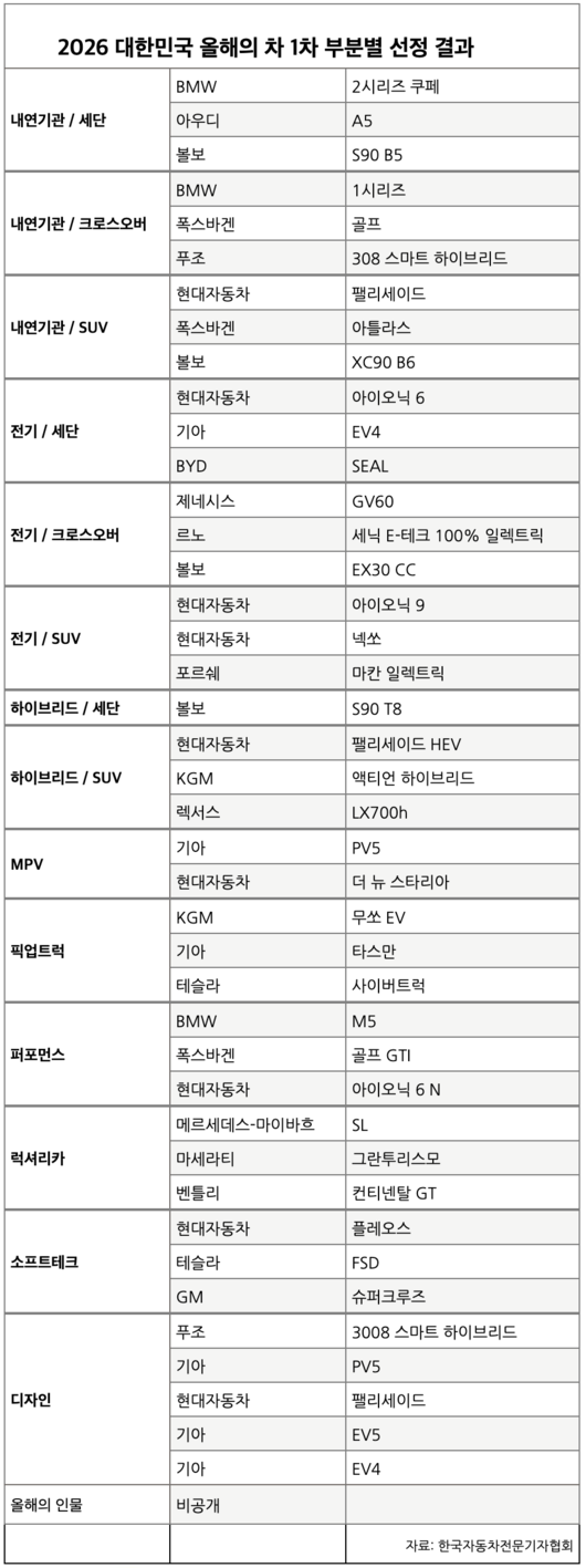 2026 대한민국 올해의 차는 대상인 ‘2026 대한민국 올해의 차’를 비롯해 △올해의 내연기관 세단 △올해의 내연기관 크로스오버 △올해의 내연기관 SUV △올해의 전기 세단 △올해의 전기 크로스오버 △올해의 전기 SUV △올해의 하이브리드 세단 △올해의 하이브리드 SUV △올해의 MPV △올해의 픽업트럭 △올해의 퍼포먼스 △올해의 럭셔리카 △올해의 소프트테크 △올해의 디자인 △올해의 인물 등 총 15개 부문에서 시상한다.