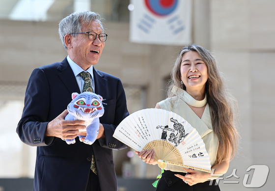 유홍준(왼쪽) 국립중앙박물관장과 넷플릭스 애니메이션 영화 '케이팝 데몬 헌터스'의 매기 강 감독/뉴스1 © News1 김도우 기자