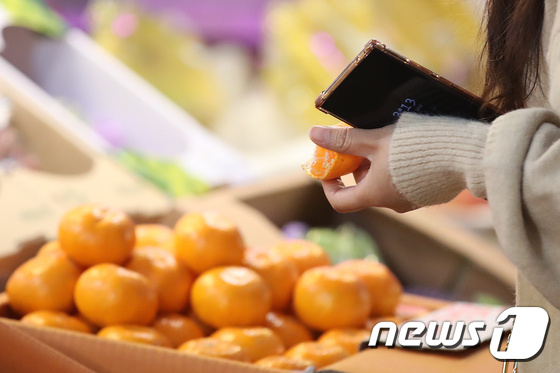 서울 마포구 농수산물 시장을 찾은 시민이 귤을 맛보고 있다. /뉴스1 © News1 이승배 기자