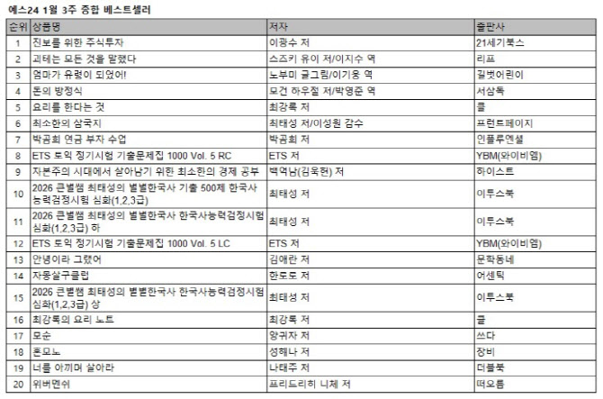 22일 예스24 1월 3주 종합 베스트셀러 순위에서 광수네복덕방 대표이자 경제 분야 전문가 이광수 교수의 ‘진보를 위한 주식투자’가 3주 연속 1위를 차지했다. 2025년 아쿠타가와상 수상작인 ‘괴테는 모든 것을 말했다’는 지난주에 이어 2위를 유지했고, 2016년 출간된 노부미의 그림책 ‘엄마가 유령이 되었어!’는 역주행하며 3위에 올랐다.