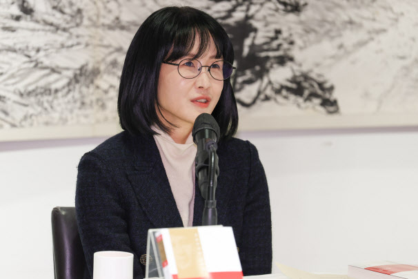 제49회 이상문학상 대상을 수상한 위수정 작가가 27일 서울 중구 달개비에서 열린 기자간담회에서 수상 소감을 말하고 있다(사진=연합뉴스).