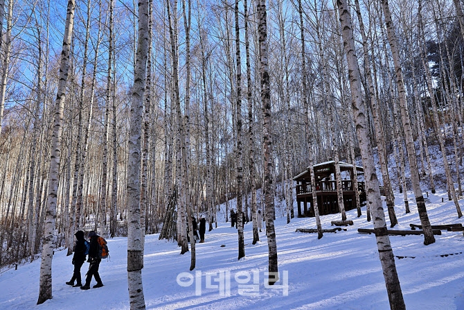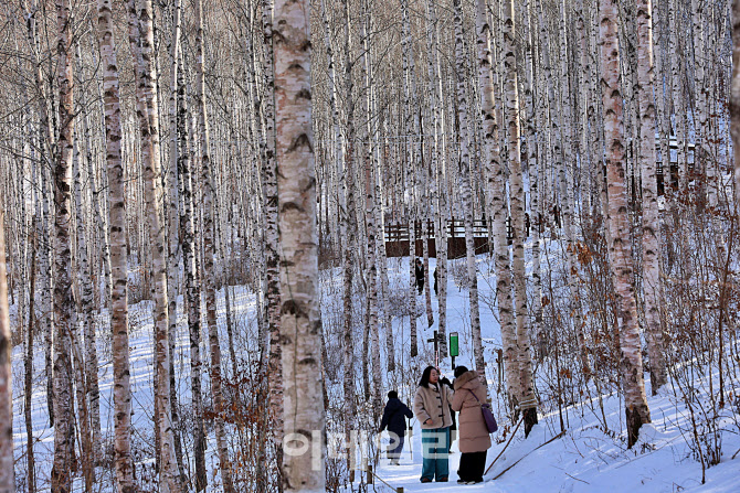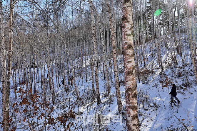 하얀 자작나무들이 빼곡히 들어선 경사면 사이로 사람들이 조심스럽게 길을 오른다. 겨울의 자작나무 숲은 풍경보다 질서에 가깝다.