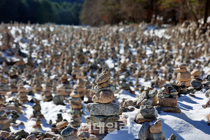백담사 계곡에 세워진 돌탑들. 누군가의 소망과 기도가 차곡차곡 쌓여 겨울 계곡을 가득 채웠다.