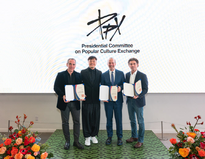 대중문화교류위원회(대중위) 특별위원 위촉식이 29일 열렸다. 왼쪽부터 몬테 립먼 리퍼블릭 레코즈 회장, 박진영 위원장, 프레드 데이비스 레인그룹 파트너 겸 음악 부문 글로벌 공동대표, 제이 펜스케 펜스케 미디어 코퍼레이션 회장 겸 최고경영자. (사진=대중문화교류위원회)