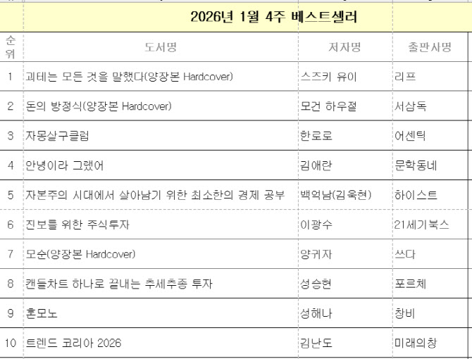 30일 교보문고가 발표한 1월 4주 종합 베스트셀러 순위에서 ‘괴테는 모든 것을 말했다’가 1위를 차지하며 인기를 이어갔다. 작품은 꾸준한 입소문과 독자층의 지지를 바탕으로 상위권을 굳건히 지키고 있다.