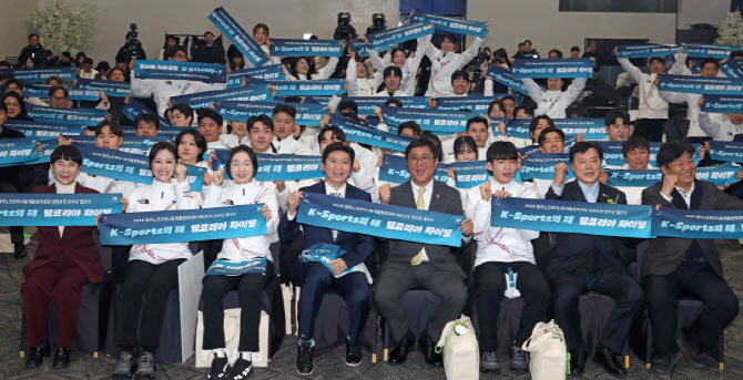 최휘영 문화체육관광부 장관이 지난달 22일 서울 송파구 올림픽파크텔 올림피아홀에서 열린 '2026 밀라노코르티나동계올림픽대회 대한민국 선수단 결단식'에 참석해 기념촬영을 하고 있다. (사진=문체부)