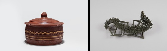 조정현_가을을 보내며_2015_옹기점토 1150C 상감기법 물레성형_지름16×11cm(왼쪽)과 최기원_작품_1960_청동_16×51×24cm_조문자기증. (김달진미술자료박물관 제공)