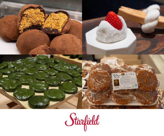 스타필드 수원에서 진행 중인 디저트 팝업 대표 메뉴. 포레포레의 두바이쫀득쿠키(상단 왼쪽부터), 자이소의 과일 찹쌀떡쑥개떡, 장인한과의 약과. (사진=신세계프라퍼티)