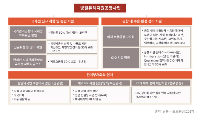 사업 첫해 일본 정부는 도쿄(하네다·나리타), 오사카(간사이), 후쿠오카 등 허브공항을 제외한 공항 중 27개소를 방일유객지원공항으로 지정했다. 이 공항들을 국제선 실적과 성장 가능성에 따라 △확대지원형 19개소 △지속지원형 6개소 △육성지원형 2개소로 구분해, 한정된 재원을 성과 가능성이 높은 공항에 전략적으로 배분하는 구조를 만들었다.