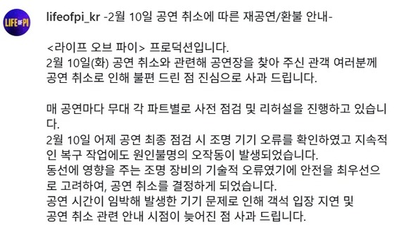 제작사 에스앤코는 11일 오후 '라이프 오브 파이' 공식 인스타그램을 통해 "2월 10일부터 11일 오전까지 이어진 기술 점검과 테스트 결과, 해당 조명 기기가 정상화됐다"며 "프로덕션 모두 무거운 책임을 통감하며 공연 취소에 따른 환불과 재공연을 안내해 드린다"고 밝혔다. 이어 "다시 한번 관객 여러분께 불편 드리게 되어 죄송하다"고 덧붙였다.