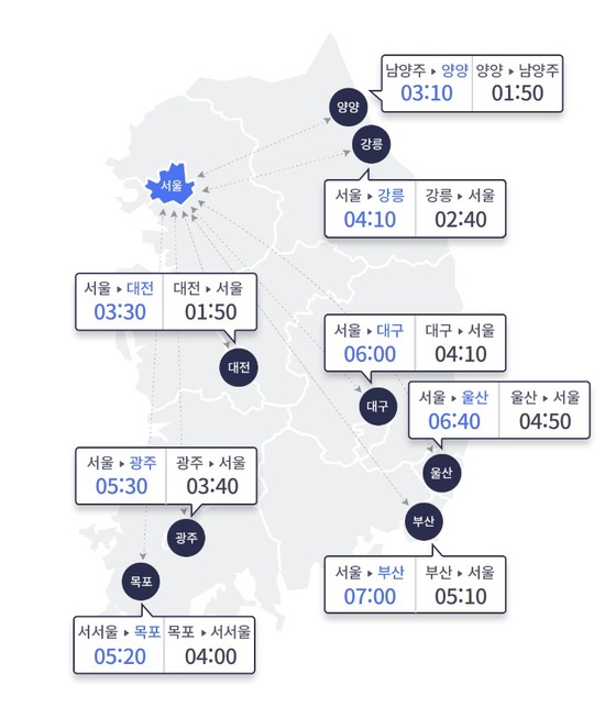 지방에서 서울까지는 △부산 5시간 10분 △울산 4시간 50분 △강릉 2시간 40분 △양양 1시간 50분(남양주 도착) △대전 1시간 50분 △광주 3시간 40분 △목포 4시간(서서울 도착) △대구 4시간 10분이 걸릴 것으로 예상된다.