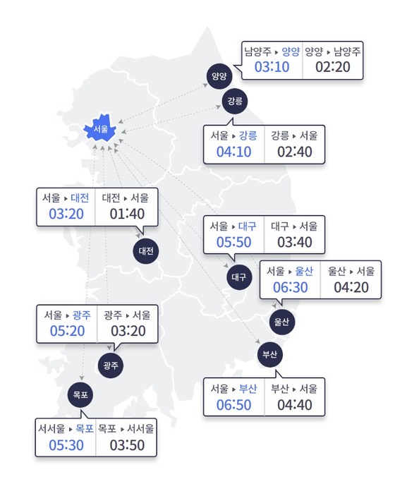 지방에서 서울까지는 △부산 4시간 40분 △울산 4시간 20분 △강릉 2시간 40분 △양양 2시간 20분(남양주 도착) △대전 1시간 40분 △광주 3시간 20분 △목포 3시간 50분(서서울 도착) △대구 3시간 40분이 걸릴 것으로 예상된다.