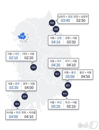 지방에서 서울까지는 △부산 5시간 10분 △울산 4시간 50분 △강릉 3시간 30분 △양양 2시간 50분(남양주 도착) △대전 2시간 20분 △광주 4시간 △목포 4시간 10분(서서울 도착) △대구 4시간 10분이 걸릴 것으로 예상된다.
