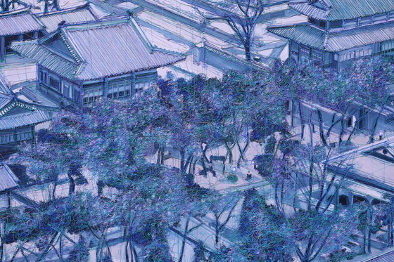 김란의 화면은 멀리서 볼 때 구조적으로 조직된 도시의 전경을 보여주지만, 가까이 다가갈수록 무수히 겹쳐진 선들의 레이어가 만들어내는 압도적인 밀도를 드러낸다. 작가의 작업은 코로나 시기 전국을 유랑하며 마주한 랜드마크, 한옥, 놀이공원 등 실제 장소에서 출발했다. 이러한 풍경들은 작가 개인의 경험과 기억이라는 여과 장치를 거쳐 화면 위에 재구성된다.