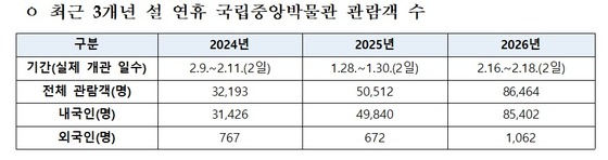 국립중앙박물관은 2026년 설 연휴 기간(2월 16~18일·17일 휴관) 동안 총 8만 6464명이 방문했다고 20일 밝혔다.