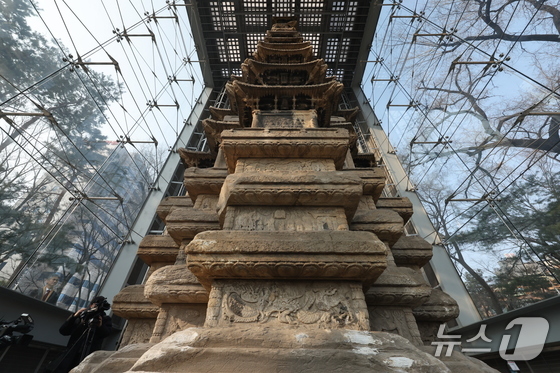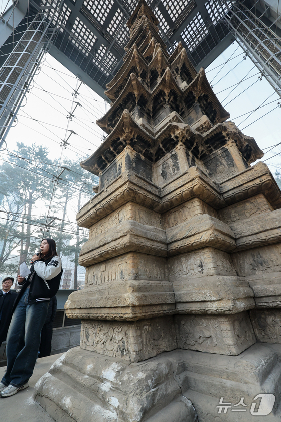 20일 오후 서울 종로구 탑골공원에서 1999년 유리보호각 설치 이후 27년 만에 처음으로 원각사지 십층석탑 내부가 공개되고 있다. 종로구는 1999년 유리보호각 설치 이후 27년 만에 처음으로 국보 서울 원각사지 십층석탑 내부를 일반에 공개한다. 기간은 내달 4일부터 15일까지며, 관람을 원하는 일반인은 서울시공공서비스예약을 통해 예약 접수를 하면 된다. 2026.2.20 © 뉴스1 안은나 기자