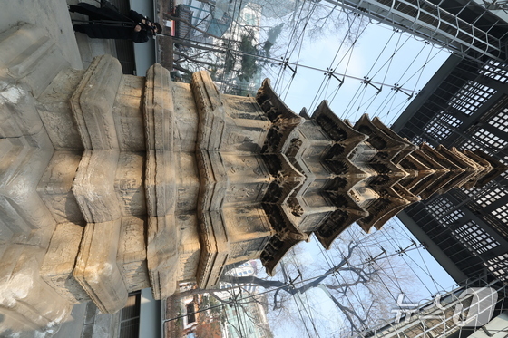 20일 오후 서울 종로구 탑골공원에서 1999년 유리보호각 설치 이후 27년 만에 처음으로 원각사지 십층석탑 내부가 공개되고 있다. 종로구는 내달 4일부터 15일까지 공개하며 관람을 원하는 일반인은 서울시공공서비스예약을 통해 예약 접수를 하면 된다. 2026.2.20 © 뉴스1 안은나 기자