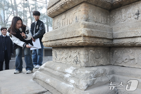 성균관대학교 동아리 '역사좀아일' 학생들이 20일 오후 서울 종로구 탑골공원에서 열린 원각사지 십층석탑 공개관람 사전공개회에서 정문헌 구청장 등 참석자들을 향해 설명하고 있다. 종로구는 1999년 유리보호각 설치 이후 27년 만에 처음으로 국보 서울 원각사지 십층석탑 내부를 일반에 공개한다. 기간은 내달 4일부터 15일까지며, 관람을 원하는 일반인은 서울시공공서비스예약을 통해 예약 접수를 하면 된다. 2026.2.20 © 뉴스1 안은나 기자