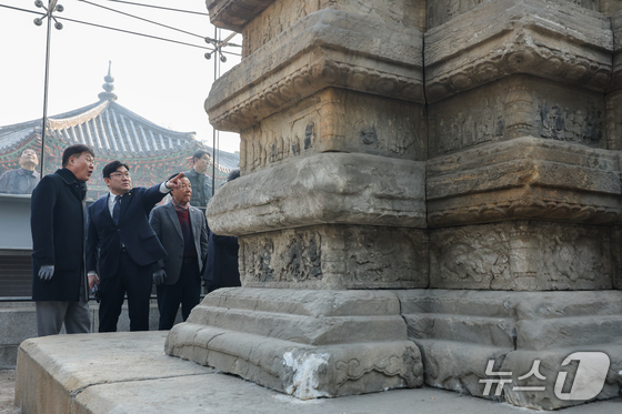 20일 오후 서울 종로구 탑골공원에서 열린 원각사지 십층석탑 공개관람 사전공개회에서 정문헌 구청장 등 참석자들이 탑을 살피고 있다. 종로구는 1999년 유리보호각 설치 이후 27년 만에 처음으로 국보 서울 원각사지 십층석탑 내부를 일반에 공개한다. 기간은 내달 4일부터 15일까지며, 관람을 원하는 일반인은 서울시공공서비스예약을 통해 예약 접수를 하면 된다. 2026.2.20 © 뉴스1 안은나 기자