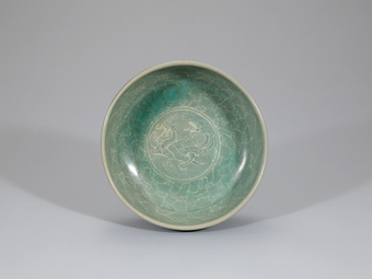'청자 상감쌍룡국화문 반'은 13세기경 제작된 것으로 추정된다. 굽이 없는 형태로, 내·외면에 빼곡하게 상감과 음각 기법을 통해 다양한 문양이 표현됐다. 내면 바닥에는 쌍룡문을 배치하고 그 배경에 파도문을 표현했는데, 두 마리 용이 배치된 것은 이례적인 사례라는 평가다.