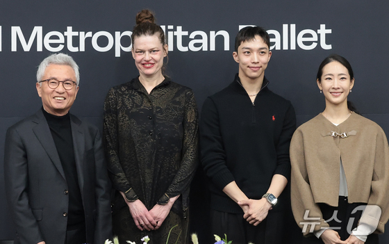 안호상 세종문화회관 사장(왼쪽부터)과 안무가 샤론 에얄, 무용수 남윤승, 김여진이 10일 서울 종로구 세종문화회관 예술동에서 열린 서울시발레단 한국 초연작 'Jakie' 안무가 샤론 에얄 내한 기자간담회에서 포즈를 취하고 있다. 2026.3.10 © 뉴스1 권현진 기자