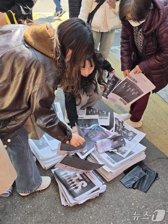 방탄소년단(BTS) 컴백 공연일인 21일 오전 서울 광화문광장 인근에서 외국인 관광객들이 일간지들이 배포한 BTS 관련 특별판을 들고 있다. 2026.3.21 © 뉴스1 박지혜 기자