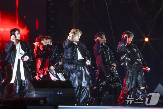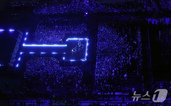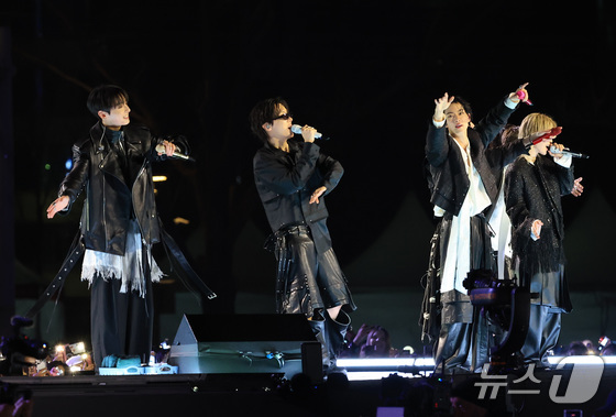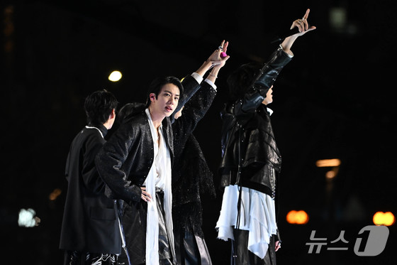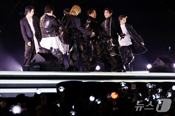 '방탄소년단(BTS) 컴백 라이브 : ARIRANG' 공연이 열리는 21일 서울 종로구 광화문 광장에 마련된 무대에서 BTS가 무대를 선보이고 있다. 2026.3.21 © 뉴스1 임세영 기자
