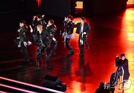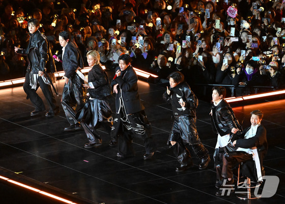 BTS(방탄소년단) 멤버들이 21일 오후 서울 광화문 공연장에서 열린 'BTS 컴백 라이브: ARIRANG' 공연에서 화려한 무대를 선보이고 있다. 2026.3.21 © 뉴스1 임세영 기자
