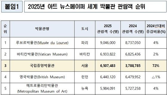 1일 국중박에 따르면 영국 미술 전문 매체 '아트뉴스페이퍼'(The Art Newspaper)가 지난달 31일 발표한 '2025년 세계 박물관 관람객 조사'에서 세계 3위를 기록했다.