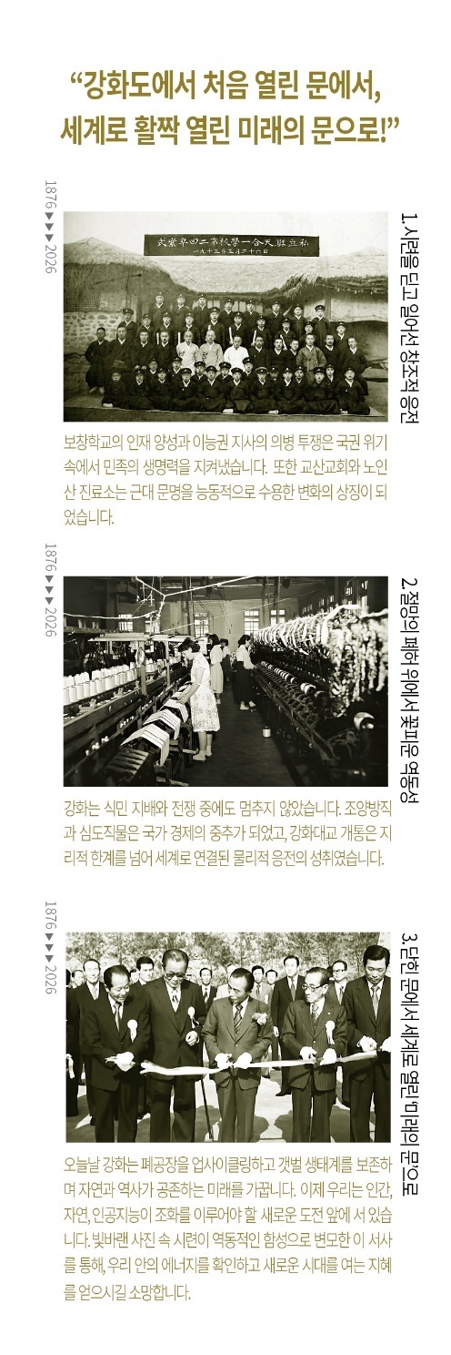이번 전시는 강화로닷컴, 강화역사문화연구소, 남궁내과의원이 후원한다. 빛바랜 사진 속에 담긴 시련의 기록이 어떻게 역동적인 함성으로 변모해 왔는지 확인하는 자리다. 강화도에서 처음 열린 문이 이제는 세계로 향하는 미래의 문으로 연결되는 서사를 통해, 새로운 시대를 여는 뜨거운 에너지를 마주할 기회다.