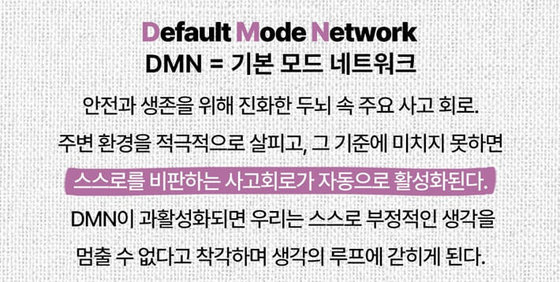 저자는 이런 악순환이 '기본 모드 네트워크'(DMN)의 자동 작동에서 비롯된다고 설명한다. 생각을 억지로 누르기보다 행동과 환경을 바꿔 흐름을 전환해야 한다는 점이 책의 첫 축이다.