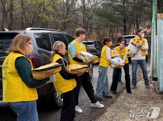 글로벌 프렌즈 봉사단은 4일 경기 성남에 위치한 동물보호소에서 안드레의바다와 함께 봉사활동을 진행했다(네츄럴코어 제공). © 뉴스1