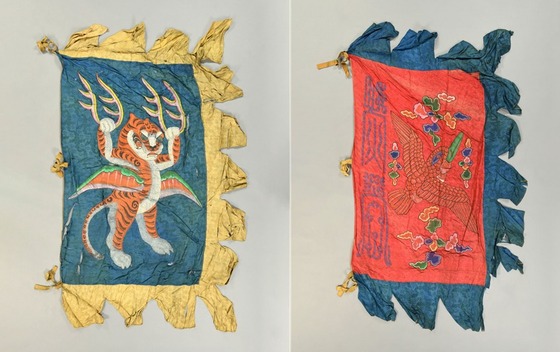 호기(왼쪽)과 주작기. 둘 다조선시대 전문(前門) 밖에 세우던 군기다.(국가유산청 제공)