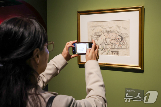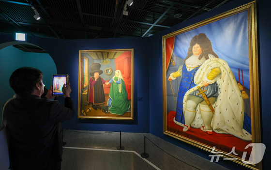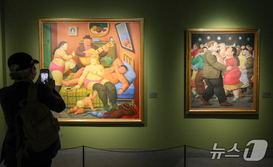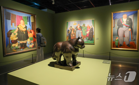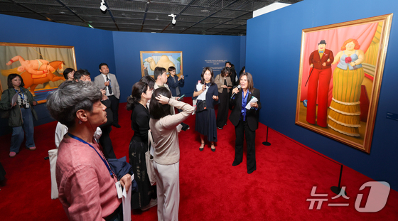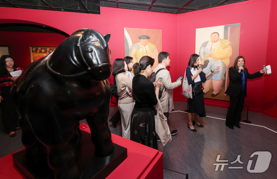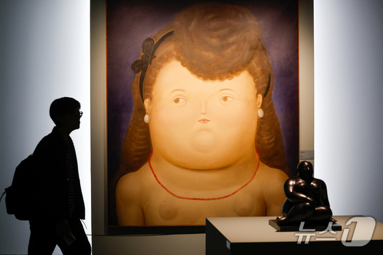 23일 서울 서초구 예술의전당에서 '페르난도 보테로: 형태의 미학' 전시 프레스투어를 찾은 참석자들이 작품을 감상하고 있다. © 뉴스1 안은나 기자