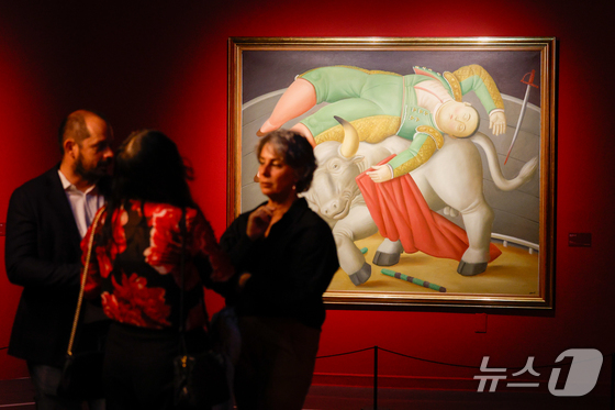 23일 서울 서초구 예술의전당에서 '페르난도 보테로: 형태의 미학' 전시 프레스투어를 찾은 참석자들이 '파블로 에스코바의 죽음'을 감상하고 있다. © 뉴스1 안은나 기자