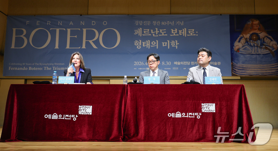 리나 보테로 페르난도 보테로 재단 대표가 23일 서울 서초구 예술의전당에서 '페르난도 보테로: 형태의 미학' 전시 기자간담회를 갖고 있다. 왼쪽부터 리나 대표, 강욱 씨씨오씨 대표, 김세연 예술의전당 예술협력본부장. © 뉴스1 안은나 기자