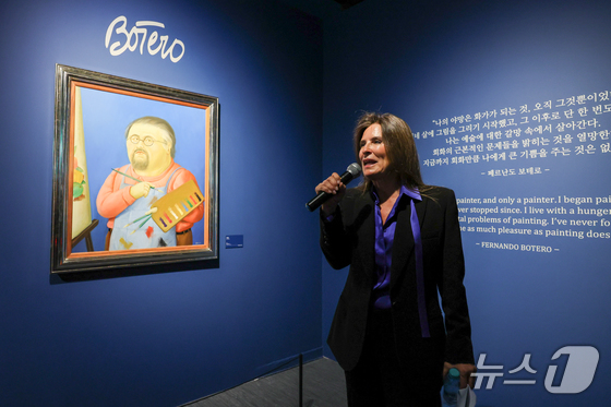 페르난도 보테로의 딸이자 재단 대표인 리나 보테로가 23일 서울 서초구 예술의전당에서 '페르난도 보테로: 형태의 미학' 전시 프레스투어 중 '자화상' 작품 앞에서 설명을 하고 있다. © 뉴스1 안은나 기자