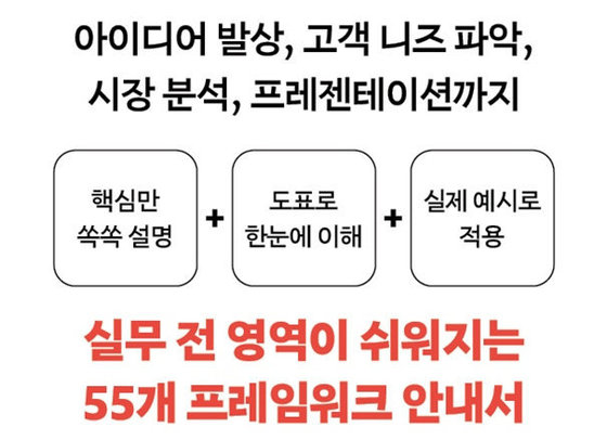 그래서 책은 발상, 고객 이해, 전략, 기획, 설득, 실행과 개선까지 실무 흐름 전체를 55개 프레임워크로 나눈다. 도표를 앞세워 복잡한 개념을 한눈에 잡게 하고, 각 틀이 언제 필요한지도 먼저 알려준다. 막힌 지점에서 필요한 도구를 바로 찾아 쓰는 사전형 구성에 가깝다.
