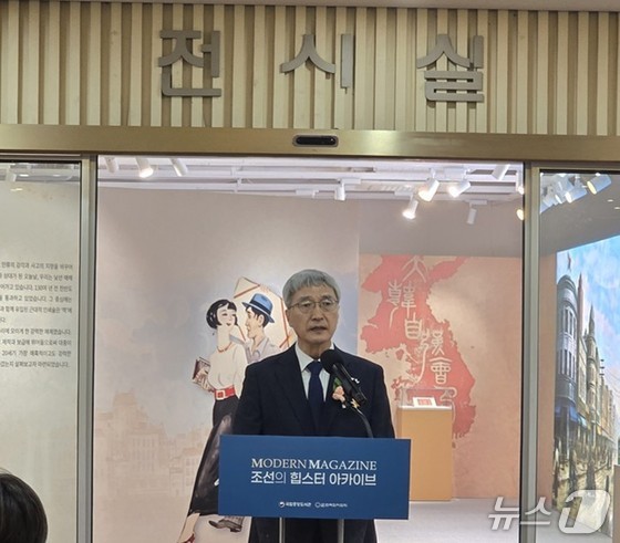 4월 27일 김희섭 국립중앙도서관 관장이 '모던 매거진 조선의 힙스터 아카이브'전 개막식에서 인사말을 하고 있다. © 뉴스1 김정한 기자