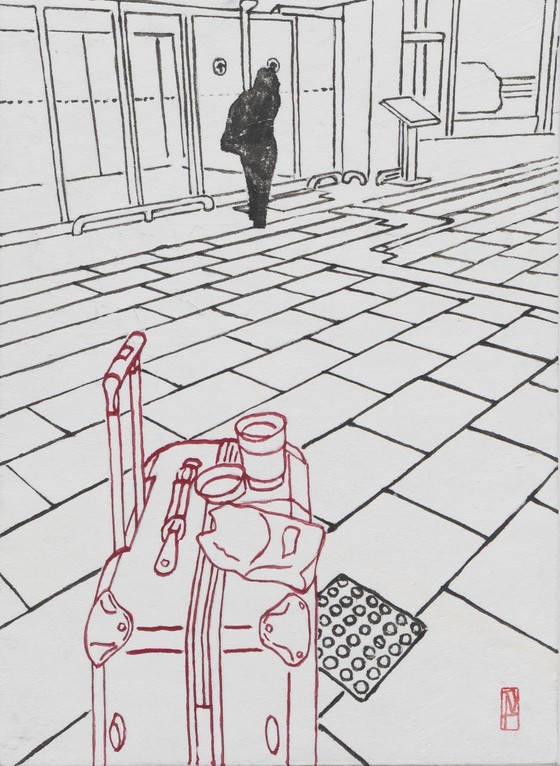 허진, <출근하며 산다 02> _ 33.5×24.2cm, 한지에 펜과 수묵, 2025(떼아트갤러리 제공)