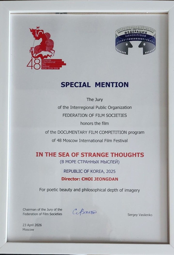 올해로 48회를 맞이한 모스크바 국제 영화제는 1935년 처음 개최된 동유럽 최초의 국제 영화제로 베니스 영화제 다음으로 오랜 역사를 자랑하는 유서 깊은 영화제이며 세계 4대 영화제 중 하나로 손꼽힌다. 현지 시각 4월 23일 열린 시상식에서 <기이한 생각의 바다에서>는 다큐멘터리 경쟁 부문 심사위원단으로부터 “시적인 아름다움과 이미지의 철학적 깊이를 기리며”라는 헌사와 함께 특별 언급상을 수상했다.