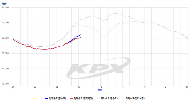 10월 3일 오전 9시20분 현재 실시간 전력수요 변동 추이. 희미한 표는 전날(2일) 24시간 추이다. (표=전력거래소)
