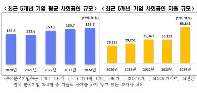 지난해 기업 1개사당 평균 사회공헌 지출액은 약 166억원으로 2002년 조사 시작 이후 역대 최대치를 기록했다. 전체 사회공헌 지출 규모도 5조3843억원으로 전년 대비 1조원 이상 증가했다. 이는 조사 응답 기업수가 확대된 영향에 더해, 기업당 평균 사회공헌 지출액이 상승한 영향으로 분석된다.