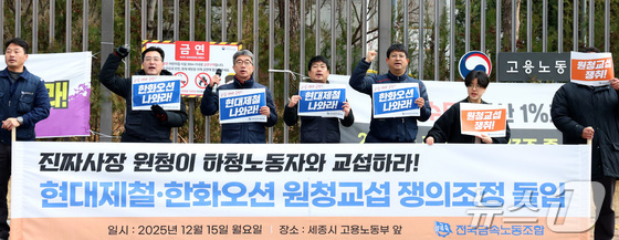 전국금속노동조합 현대제철·한화오션 비정규직지회와 거제통영고성조선하청지회 조합원들이 15일 오전 세종시 고용노동부 앞에서 쟁의조정 돌입 기자회견을 열고, 현대제철과 한화오션 원청의 즉각적인 교섭으로 노동자의 처우 개선을 요구하며 중앙노동위에 쟁의조정 신청서를 제출했다. 2025.12.15/뉴스1 © News1 김기남 기자
