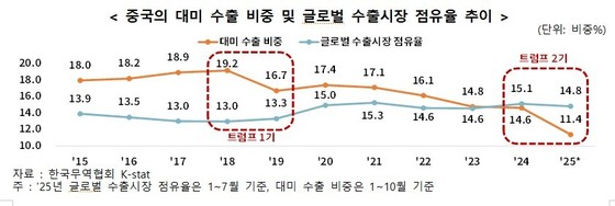 실제 중국의 대미 수출 비중도 트럼프 1기인 2019년에는 전년 대비 2.5%포인트(p) 줄었지만, 글로벌 수출시장 점유율은 0.3%p 늘어났다. 특히 트럼프 2기 들어 지난 2월부터 미국의 대중 수입관세가 인상되며 올해 1~10월 중국의 대미 수출은 전년동기 대비 17.7% 감소했다. 하지만 대세계 수출은 베트남(22.3%), 인도(12.3%) 등 제3국을 중심으로 5.3% 증가했다.