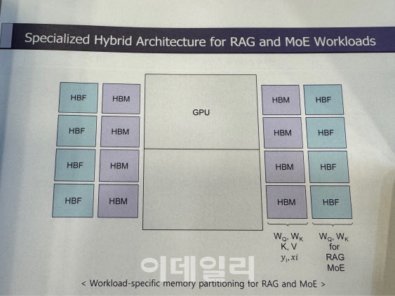 김정호 한국과학기술원(KAIST) 전기전자공학부 교수가 3일 서울 중구 프레스센터에서 열린 ‘HBF 연구소개 및 기술개발 전략 설명회’에서 소개한 HBF-GPU-HBM 아키텍처.(사진=공지유 기자)