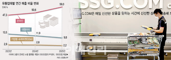 3일 산업통상부에 따르면 국내 온라인 유통산업 비중은 2024년 전체의 50.6%를 차지한 데 이어, 지난해에는 59.0%를 기록하며 1년새 8.4%포인트 상승했다. 반면 오프라인 유통채널인 대형마트와 기업형 슈퍼마켓(SSM)의 비중은 매년 감소해 지난해 기준 각각 9.8%, 2.2%까지 내려앉았다. 이미 국내 유통시장은 쿠팡을 필두로 한 온라인 쇼핑(이커머스)에 쏠린지 오래다.