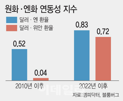 4일 금융정보 단말기 엠피닥터 등에 따르면 2022년 이후 원·달러 환율과 달러·엔 환율의 상관계수는 0.83까지 높아졌다. 상관계수가 1에 가까울수록 두 변수의 움직임이 밀접하다는 의미로, 엔화가 움직이면 원화도 거의 동시에 반응하는 수준이다. 글로벌 외환시장에서는 이미 원화를 엔화가 오르내릴 때 같은 방향으로 움직이는 통화로 인식하고 있다.