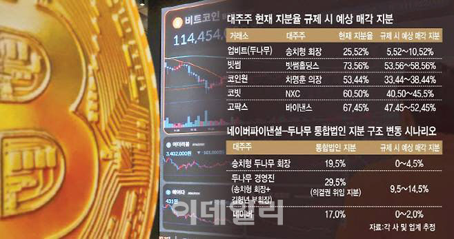 5대 디지털자산거래소의 대주주에 대한 지분 규제가 적용되면 5대 거래소의 지분 매각이 불가피하다. (그래픽=이데일리 김일환 기자)