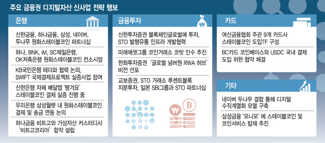 이처럼 은행권은 원화 스테이블코인과 커스터디(수탁업무)를 주력 사업으로 삼아 결제 혁신을 주도하고 있고, 증권사들은 ‘한국판 로빈후드’를 꿈꾸며 토큰증권발행(STO)과 실물기반 토큰화자산(RWA)으로의 영토 확장을 노리고 있다. 카드사들은 자체 태스크포스를 가동하면서 스테이블코인을 기반으로 한 일상 결제망을 구축하고자 한다. 그뿐 아니라 네이버와 카카오, 삼성금융그룹 등은 디지털 플랫폼 패권을 놓고 경쟁에 뛰어 들고 있다.